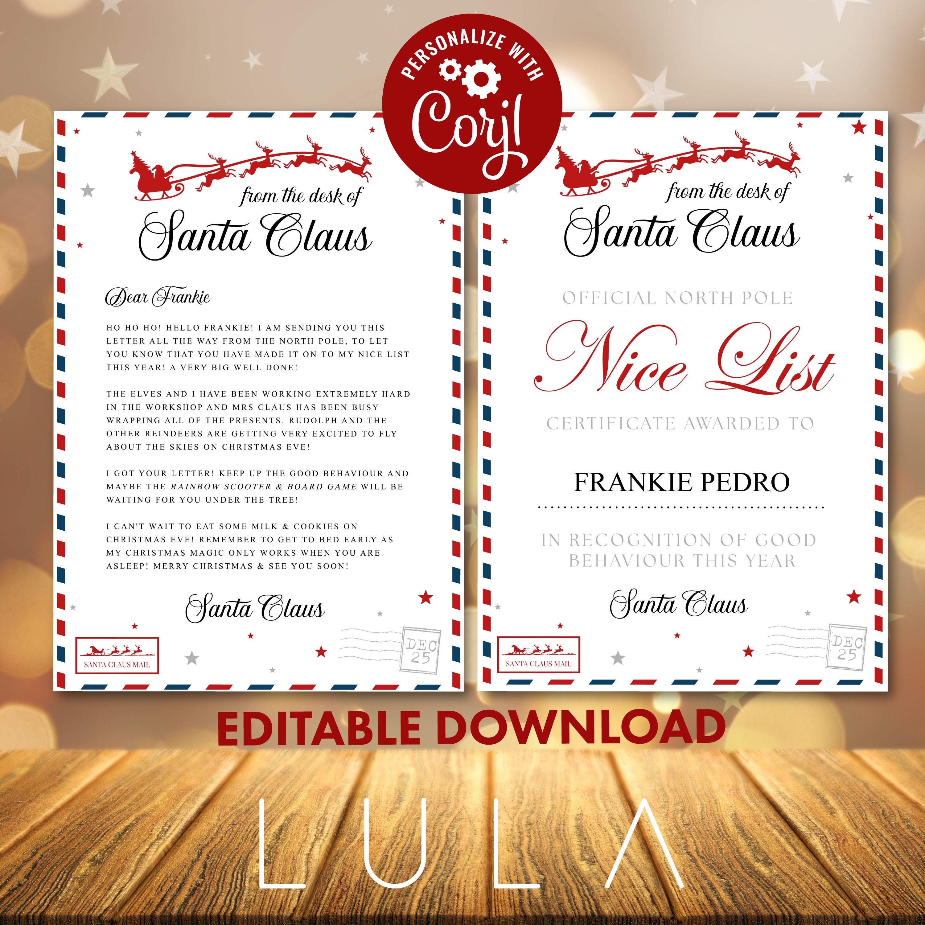 Personalise the child's name at the top of the letter, within the letter and change the present ideas. All of the text is editable if you need to amend the letter. This printable also includes a FREE Nice List Personalised Certificate.